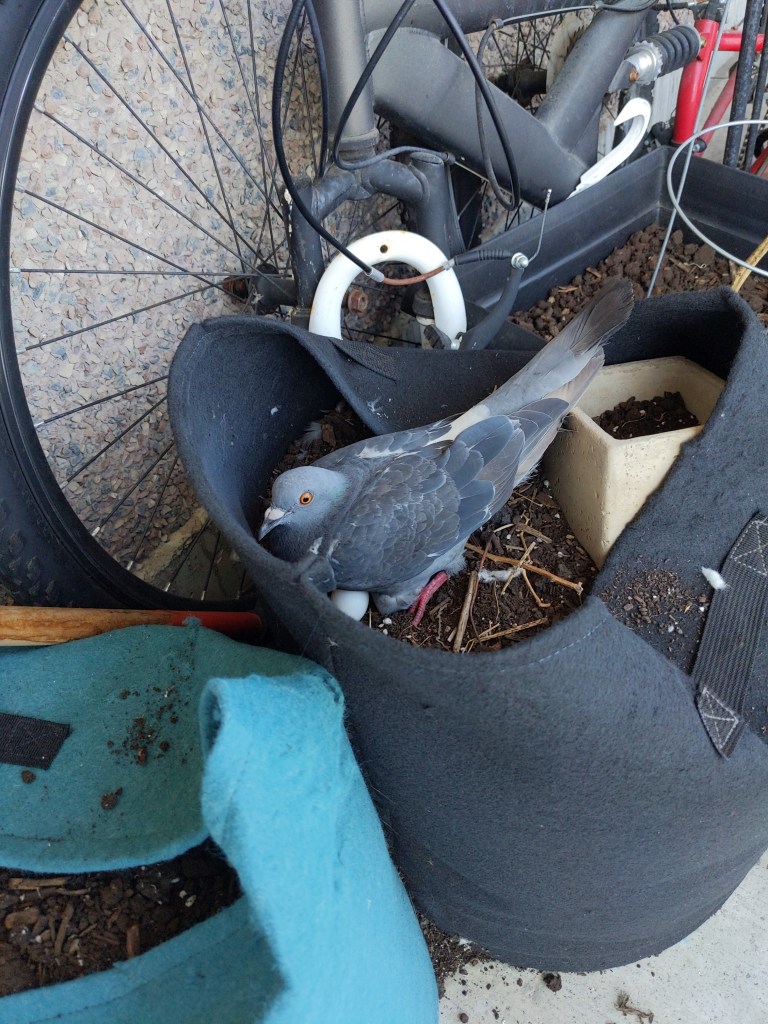 While he was gone, one of my duties in caring for the apartment was to chase pigeons off the balcony whenever I heard them out there and make sure none of them roosted on the balcony. However, between work and a few other duties at home, I couldn’t be there all the time. So, there ended up being a pair of pigeons who took up a nest on his balcony and laid a pair of eggs.